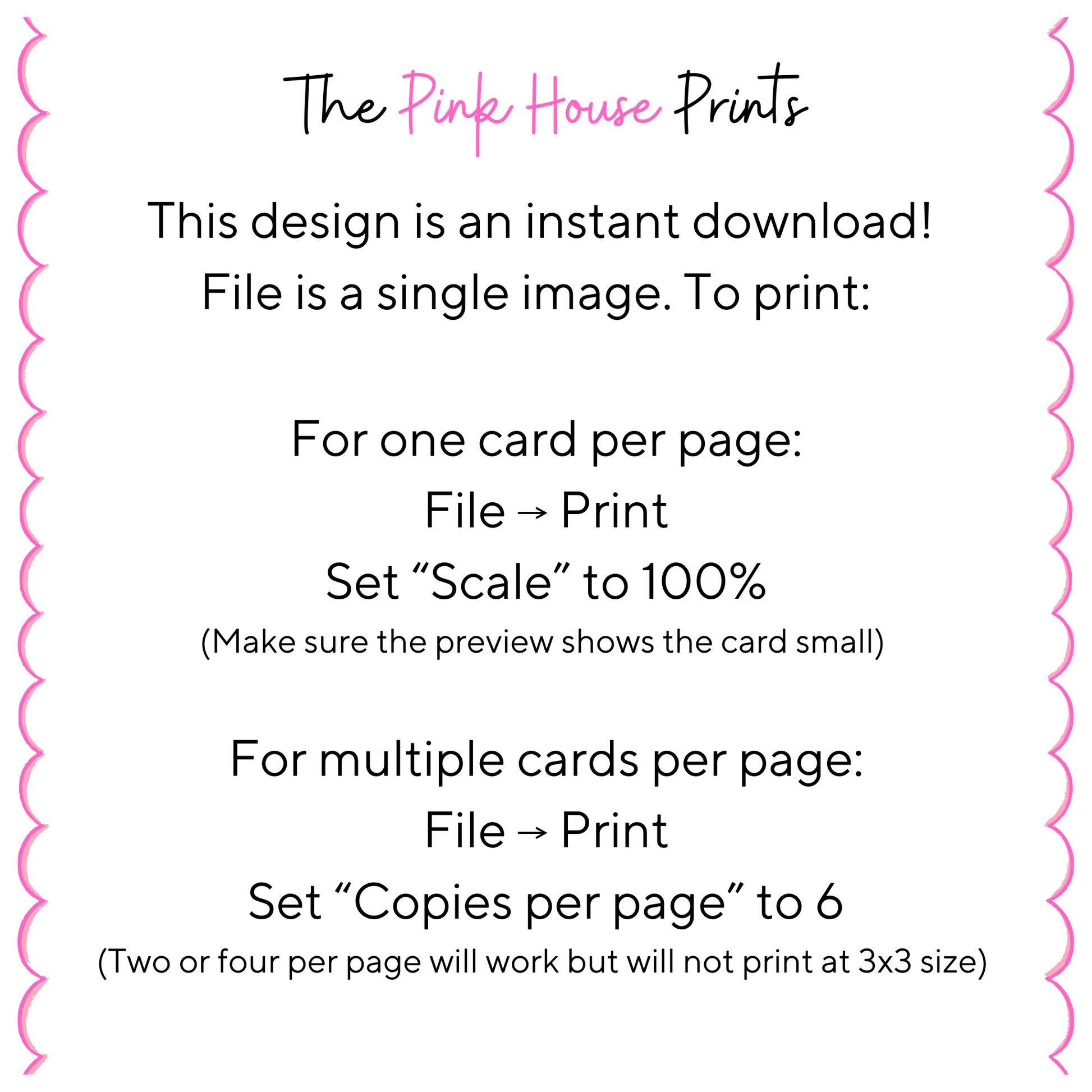 Order includes one PDF document with with bleed & trim marks for easy cutting! Instructions for printing multiple per page are pictured in the listing images!